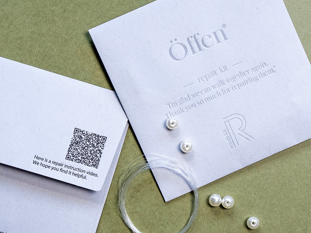Öffen(オッフェン)のパールのついたシューズ用のリペアキットです。 リペア方法はこちらから https://x.gd/ZHkZR または商品に印字されたQRコードを読み取り手順をご確認ください。 <対象品番> SPO-0007, WPO-0025, WRO-0010, WSQ-0304 https://shop.offen-gallery.com/categories/6312652 <内容物> パール:5個 テグス:250cm ※針はご用意ください。