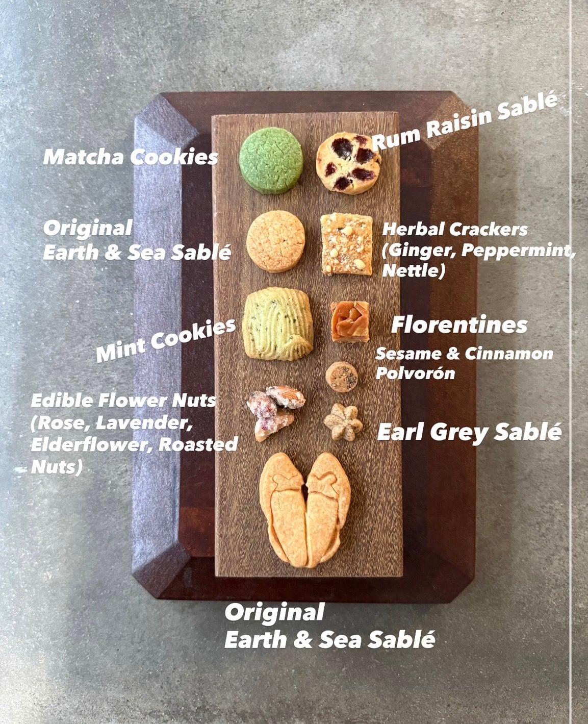 内容:靴型サブレ、大地と海のサブレ、ミントクッキー、ハーブクラッカー、抹茶クッキー、ラムレーズンのサブレ、胡麻とシナモンのポルポロン、アールグレイのサブレ、エディブルフラワーナッツ、フロランタン