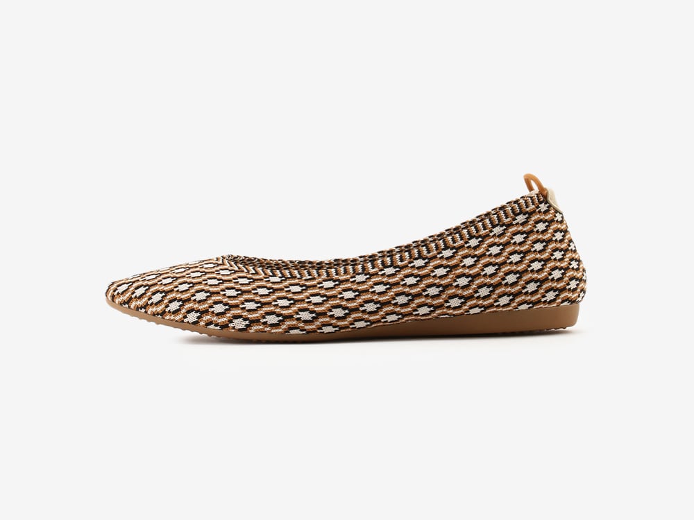 パッと目を惹く抽象的でモダンなグラフィックは、伝統的なオリエンタルパターンから着想を得たもの。テキスタイルアートを彷彿とさせる暖かく曖昧なカラーで心地よさと豊かさを表現。存在感のある一足はコーディネイトのスパイスに一役。足元がすっきりと見えるポインテッドトゥと履き口のVカットでシンプルに仕上げました。